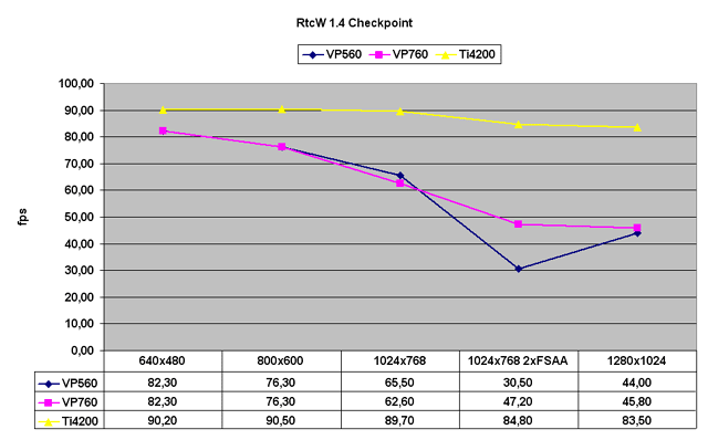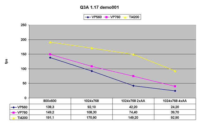 Auch hier scheint die VP560 aus ihrer HSR Technik keinen Nutzen ziehen zu können. Zudem zeigt sich genau wie bei RtcW beim Zuschalten des Anti Aliasing eine dramatisch reduzierte framerate. |