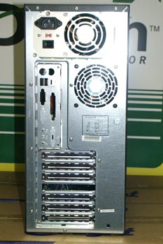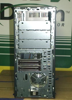 Ein Blick unter die Haube gibt den Blick auf die 4 5,25" und 3 3,5" Einbauschächte frei.Mehr gibt es auch nicht.Für die meisten Benutzer sollte das aber ausreichend sein.Auf der Vorder-und Rückseite befinden sich sauber ausgearbeitete Öffnungen für Zusatzlüfter. Auf der Rückseite ist bereits ein mäßig lauter 80er SUNON Lüfter eingebaut,der die Luft nach außen befördert.Er läßt sich aber sehr leicht mit den mitgelieferten Plastikstiften durch ein anderes Modell ersetzen. |