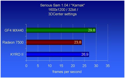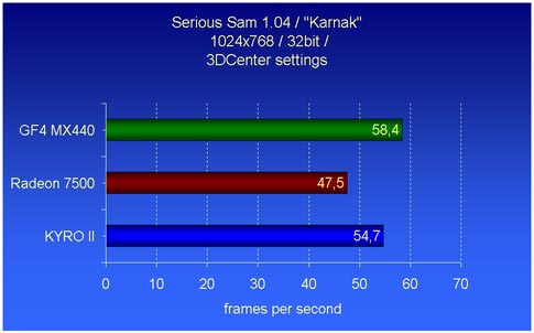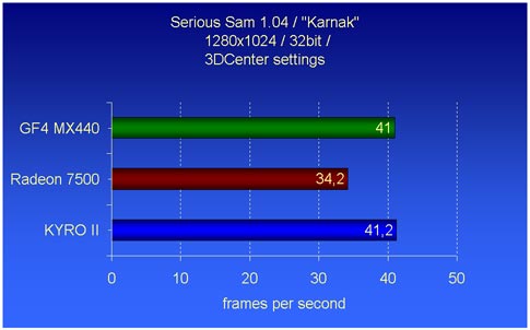 Die Serious Engine aus dem Jahr 2000 sorgte damals für ungläubiges Staunen, da sie einen Effektreichtum bei bis dato für unmöglich gehaltenen frameraten bot. Durch 4-faches Multitexturing läuft "die beste Techdemo der Welt" auf KYRO vergleichsweise sehr gut.