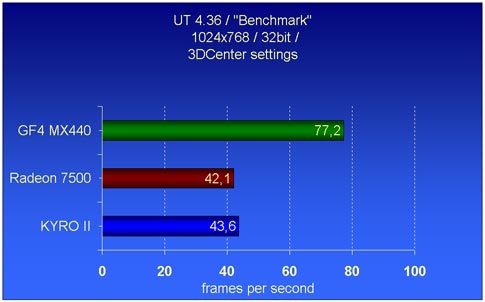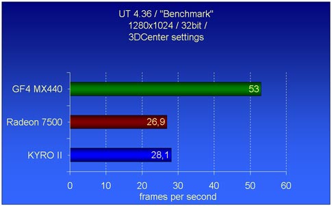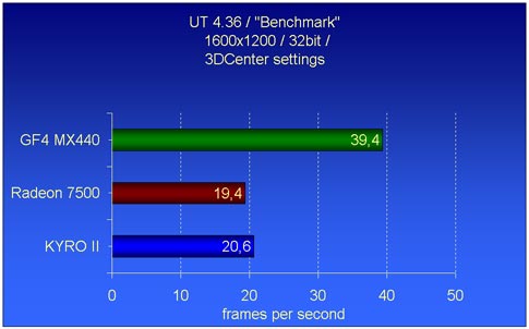 Hier "outperformed" der GF4MX440 die beiden Mitstreiter um etwa das doppelte. Eine souveräne Vorstellung!