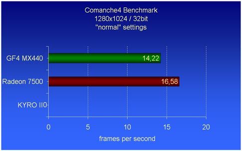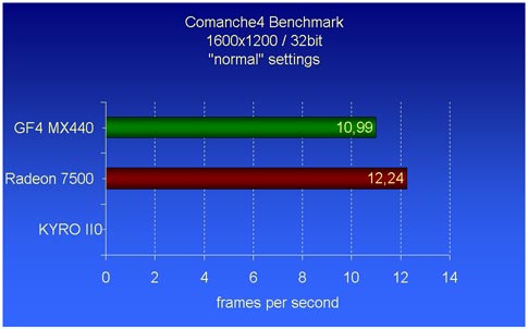 Dieser DX8.1 Benchmark basiert auf Novalogic`s neuer Helisimulation und macht ausgiebig Gebrauch von Pixel und Vertex Shader Funktionen. Angeblich sollen bis zu 200.000 Dreiecke pro Szene verwendet werden. Das reißt jede Grafikkarte vom Hocker und fordert eine schnelle CPU. Karten ohne Hardware T&L werden gar nicht erst zum Test zugelassen. Auf einer Hercules 4500 mit KYRO II startet der Benchmark dementsprechend nicht. Das enT&L des KYRO II SE sollte dagegen funktionieren - deswegen habe ich den Test ursprünglich aufgenommen (März 2002). Doch leider sind Karten mit diesem Chip zum gegenwärtigen Zeitpunkt (Juni 2002) immer noch nicht erhältlich :(...