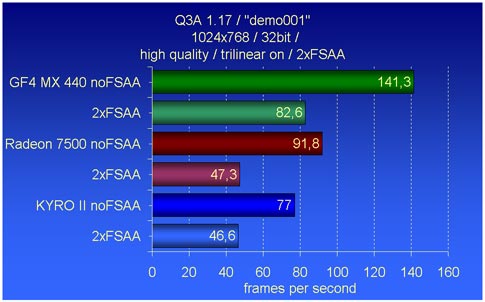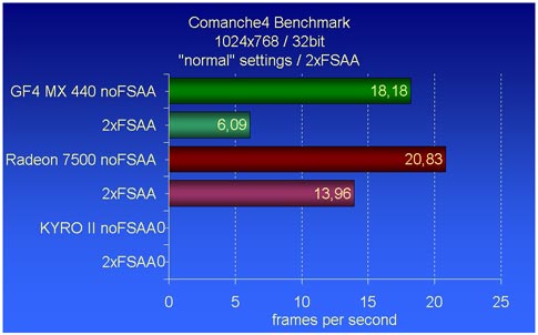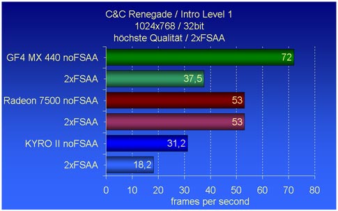 Erwähnenswert ist jedoch die Tatsache, daß der Radeon 7500 kein horizontales 2xAA einschaltet sobald Fog verwendet wird. Dieses Manko hat er mit seinem "großen Bruder" dem 8500 gemein. Dabei handelt es sich nicht etwa um einen bug, sondern wie Tommti Systems herausgefunden hat um eine Hardwarelimitierung seitens ATI. Dieses macht sich beim FSAA Test mit C&C Renegade bemerkbar - der Wert bleibt auch mit aktiviertem FSAA bei 53 fps.