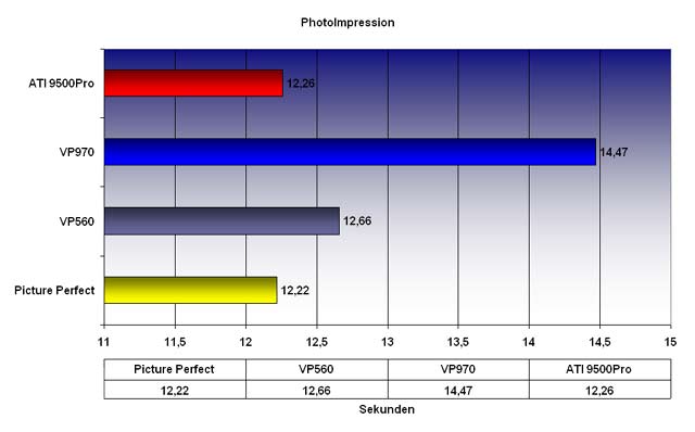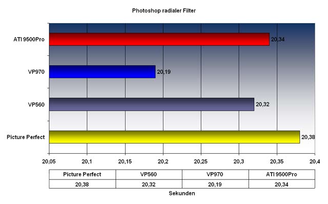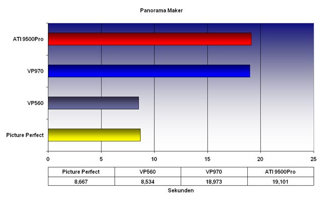 Der nur als retail Version angebotenen Graphics Blaster Picture Perfect liegen 3 englischsprachige Programme der amerikanischen Firma Arcsoft bei.Dieses sind im einzelnen: Um eine mögliche Optimierung der mitgelieferten Einzelbilder auszuschließen habe ich mich mit einem Stativ und meiner Minolta Dimage 5 in den Garten begeben und insgesamt 9 Bilder mit einer Auflösung von 1280x960 Pixel gemacht. Jedes Bild hat eine Größe von etwa 700 kb. Das alles geht nach wenigen Minuten Einarbeitungszeit sehr leicht von der Hand, da die (wenigen) Optionen sehr übersichtlich gehalten sind. Ein absoluter Pluspunkt den die weit verbreitete Freewaresammlung PanoTools des Professors Dersch von meiner ehemaligen Lehranstalt, der FH Furtwangen, vermissen läßt. Die Optionen dort sind so vielfältig und für den Laien (welcher ich auf dem Gebiet der Panaoramafotografie bin) unverständlich daß es mir selbst nach mehr als einer Stunde Arbeit an meinem "Gartenfoto" nicht gelang dieses als Panoramabild auszugeben. Wer sich die fertige VRML Anwendung ansehen will kann sie hier betrachten. Sowohl die Graphics Blaster Picture Perfect als auch die VP560 setzen die Einzelbilder in weniger als der Hälfte der Zeit zusammen, die die VP970 oder auch die ATI Radeon 9500Pro benötigen.Hier liegt also wirklich eine optimale Anpassung der Software an die Hardware vor.Daß diese Optimierungen nicht nur auf den VP500SE wirken sondern auch auf den VP500 zeigt erneut, daß die Architektur beider Chips nicht sehr weit entfernt voneinander ist. Hier wurde ein hochauflösendes Bild der niemals erschienen Hercules 4800 mit dem Filter "melting" versehen.Verwendet wurde die Intensität von 100%. Die Ausführungsgeschwindigkeit beträgt bei allen Karten zwischen 12 und 14 Sekunden - von einer Optimierung der Graphics Blaster Picture Perfect ist nichts zu sehen, der AthlonXP muß diese Aufgabe alleine lösen. Hier wurde der radiale Weichzeichner mit der Stärke 100% und der höchsten Qualitätsstufe auf eine 2,8MB große TIF Datei angewandt. Auch diese anspruchsvolle Aufgabe kann die Picture Perfect nicht beschleunigen - aber davon, daß Photoshop Filter beschleunigt werden ist auch nirgends die Rede,obwohl dies durch eine Anpassung an die VPUs seitens Adobe durchaus möglich wäre. |