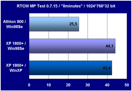 home | Return to Castle Wolfenstein Multiplayer Test Das neue in Kürze erwartete Sequel zum in Deutschland indizierten '92er Verkaufsschlager "Castle Wolfenstein" dürfte mit seiner aufgebohrten Quake 3 Engine ebenfalls zum Hit des nächsten Jahres werden. Verwendet wird ein 8 minütiger Mitschnitt des "beachhead" Levels. ![]() Die 75%ige Steigerung der framerate zeugt von der bekanntermaßen guten bis sehr guten Skalierung des KYRO II. |