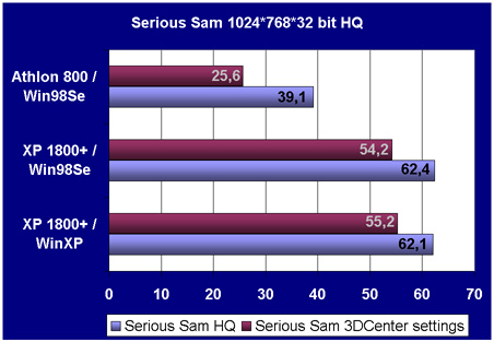 home | Serious Sam 1.04 Serious Sam glänzt mit einer hochmodernen und auf KYRO Karten sehr schnellen Grafik. Hier kann er u.a. von seinem 8-fachen multitexturing profitieren, da Serious Sam bis zu 5 davon gleichzeitig verwendet. Die Serious Engine ist in Lizenz von Croteam erhältlich und es bleibt zu hoffen, daß sie Verwendung in mehr Spielen findet. ![]() Hier geht die Post richtig ab ! Mehr als 100% Steigerung der Bildrate mit den sehr anspruchsvollen 3D Center settings übertreffen meine Erwartungen bei weitem. Eine mögliche Erklärung liefert die Homepage von Croteam: Die SSE-Unterstützung des Athlon XP wirkt sich bei dem verwendeten OpenGL-Befehlssatz sehr positiv aus. Desgleichen sollte man somit auch von den normalen settings erwarten, doch hier scheinen Füllrate und/oder Speicherbandbreite des KYRO II ein Limit zu setzen. |