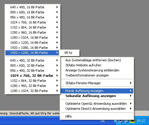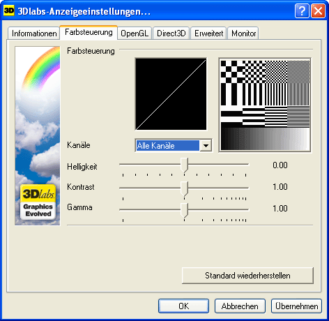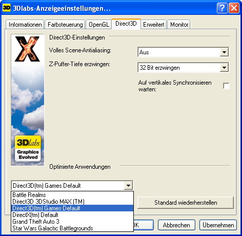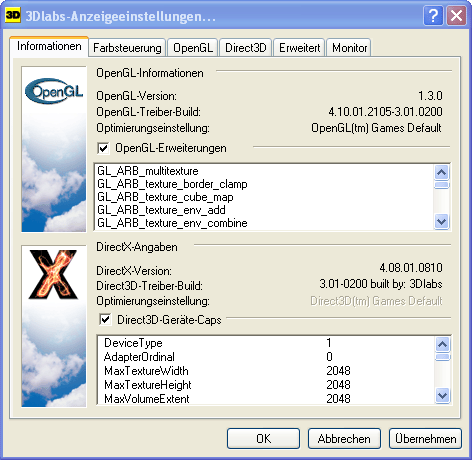 Ganz klar fallen die kargen Einstellmöglichkeiten für DirectX auf - hier wird am ehesten deutlich, daß die Karten nicht für den Spielesektor gedacht sind. Wer mehr will als AntiAliasing und Z-Buffer Tiefe muß sich umständlich der Windows registry bedienen.