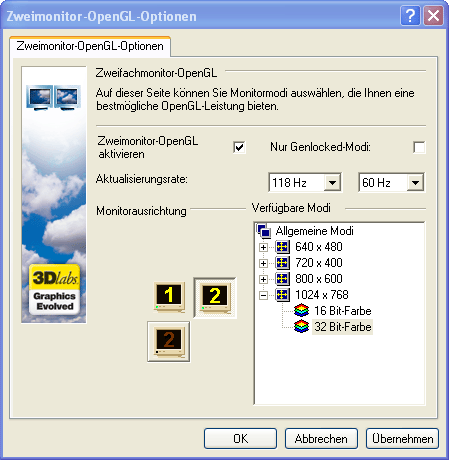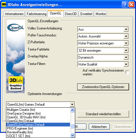 Dagegen steht das Konfigurationsmenü für OpenGL: die Liste der unterstützen professionellen OpengL Anwendungen enthält 34 Profile und beinhaltet u.a. solche Programme wie 3DPaint, Autodesk,Catia,Espri,Lightwave,Maya,PRO/Engineer,SoftImage,SolidWorks und Unigraphics. Unterstrichen wird der unzweideutige Anwendungsbereich der Wildkatzen auch durch das Menü für beschleunigte OpenGL Applikationen auf 2 Geräten, die bei Bedarf per Genlock synchronisiert werden können.