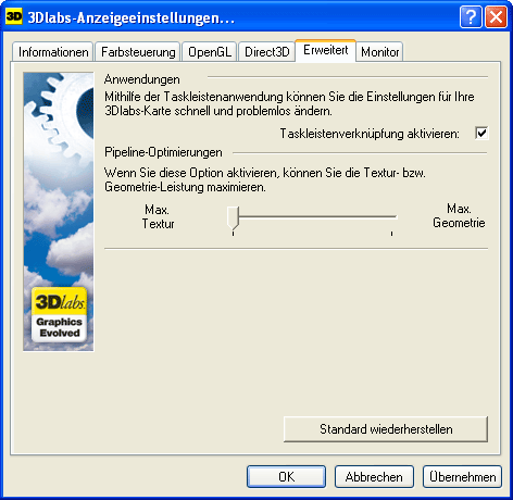 Äußerst interessant schien kurz nach Erscheinen des ersten reviews der VP-Karten im Sommer diesen Jahres das Pipeline Optimierungsmenü. Mittels eines ohne Zwischenstufen versehenen Schiebereglers läßt sich die VPU auf maximale Geometrie - oder Texturleistung einstellen, wobei möglicherweise Taktraten,Cachestategien und -größen verändert sowie auch einige Prozessoren mehr für den jeweiligen Aufgabenbereich zugeschaltet werden.Nach einem reboot ist die Einstellung aktiv.