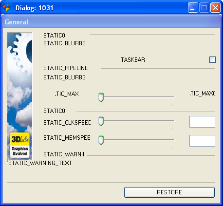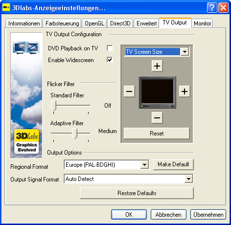 Schade jedoch, daß 3DLabs uns folgende Erweiterungen vorenthält: Das Kontrolpanel enthält also Informationen über Chip- und Speichertakt und bietet die Option zur Übertaktung. Leider werden die Anzeigefelder sowie die beiden Schieberegler für die Taktraten zur Laufzeit deaktiviert und nicht sichtbar gemacht. Ich habe es bislang weder durch dem Anschein nach entsprechende registry settings noch durch den Einsatz geeigneter tools geschafft diese Menüpunkte zur Laufzeit zu aktivieren :(... Nach der Installation eines Treibers vom Spätsommer fand ich u.a. dieses TV-out Menü: Weder die VP560, noch die VP760 oder die VP870 sind mit einem TV-Ausgang versehen. Meiner Kenntnis nach besitzt auch die VP970 keinen.Welcher 3D-Designer,der stundenlang im Büro mit Unmengen von Polygonen und Texturen zu kämpfen hat, benötigt aber DVD- Wiedergabe auf einem Fernseher? Das TV-Out Menü ist also unzweifelhaft für eine der nächsten Karten vorgesehen... |