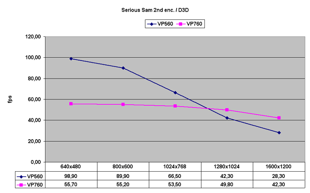 SLIPSTREAM ! Während die VP760 im Vergleich zu OpenGL anfangs nur eine halbierte framerate liefern kann, steigt die VP560 auf unverändert hohem Niveau ein und hält dieses beständig! Die OpenGL Performance wird 1:1 in D3D umgesetzt. Anhand nachfolgender Diagramme wird das gut deutlich: VP760: OpenGL vs. D3D: