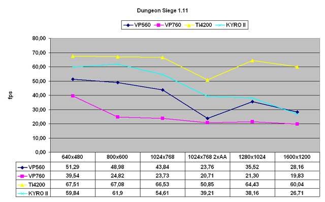 ![]() Die CPU-Limitierung von Dungeon Siege wird anhand der Ti4200 deutlich. Die VP560 profitiert erneut von Slipstream:die 60% Leistungsschub die 3DLabs versprochen hat sind keine graue Theorie und eher noble,englische Zurückhaltung! |